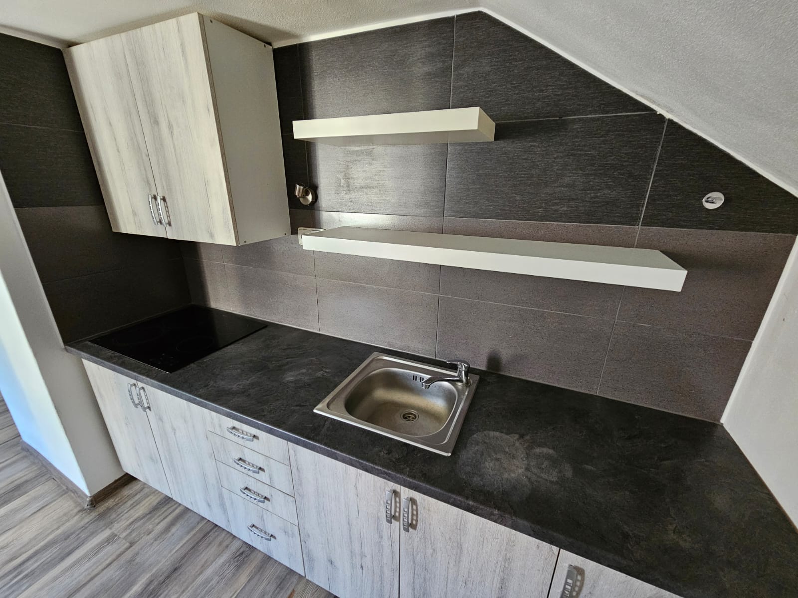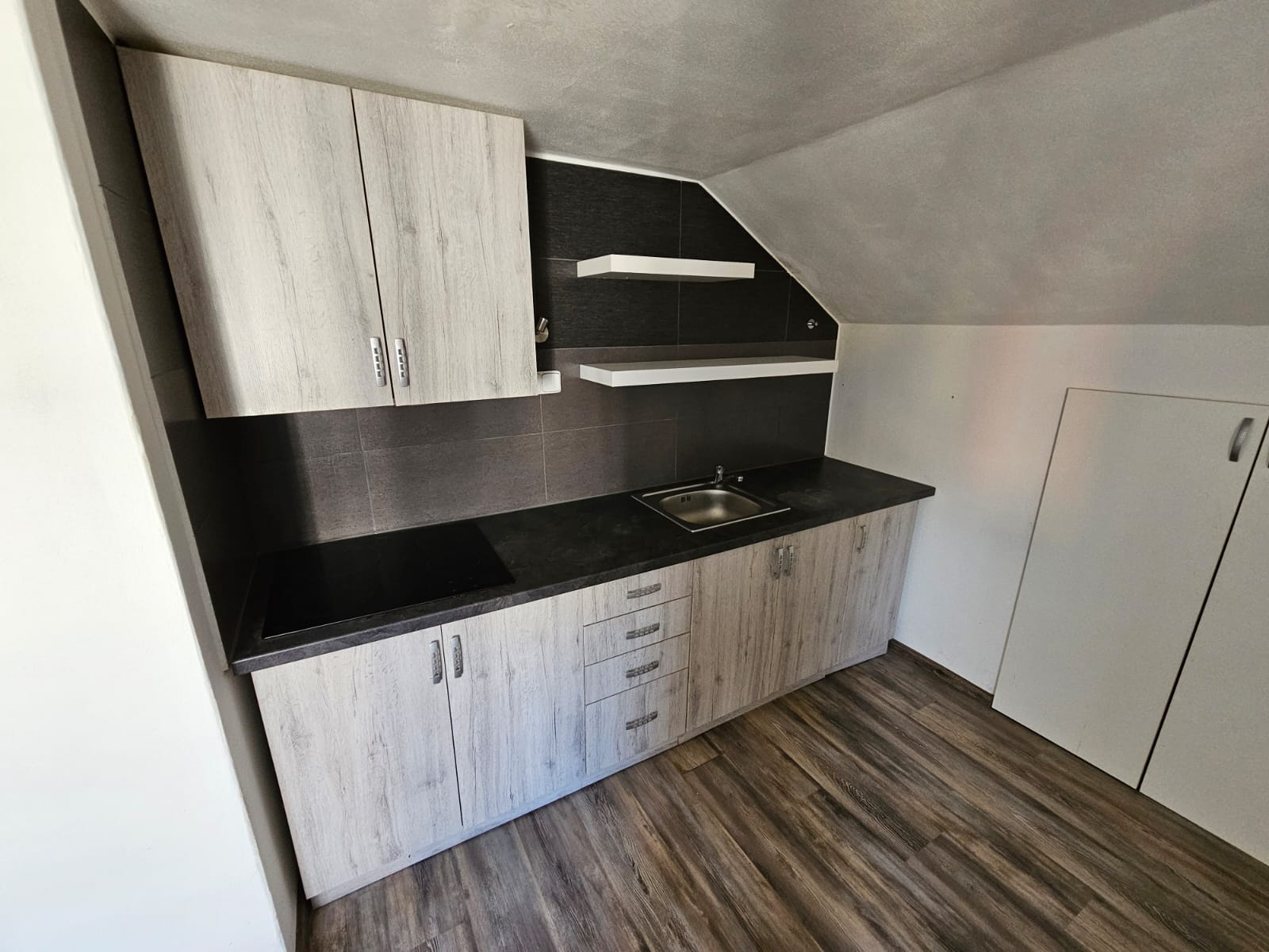 - Kuchyň – moderní kuchyňská linka s indukční deskou a elektrickou troubou, ideální pro vaření a přípravu jídel.