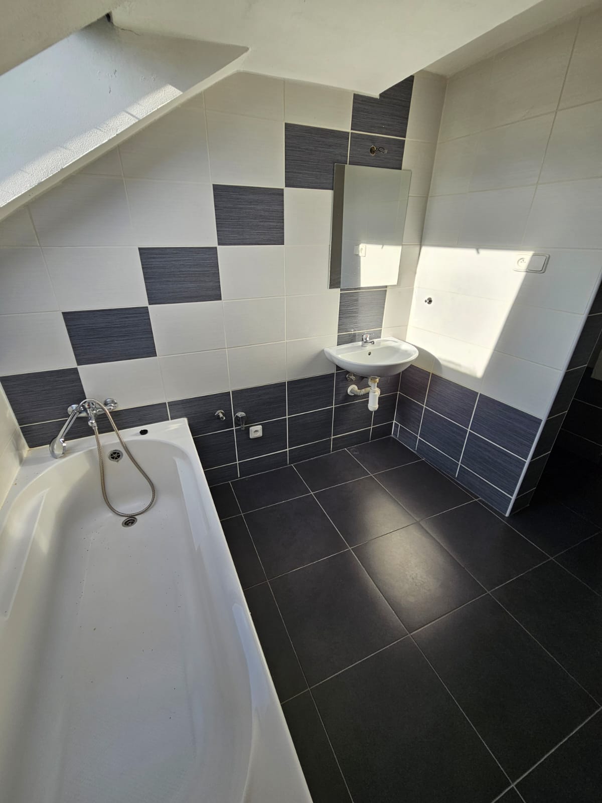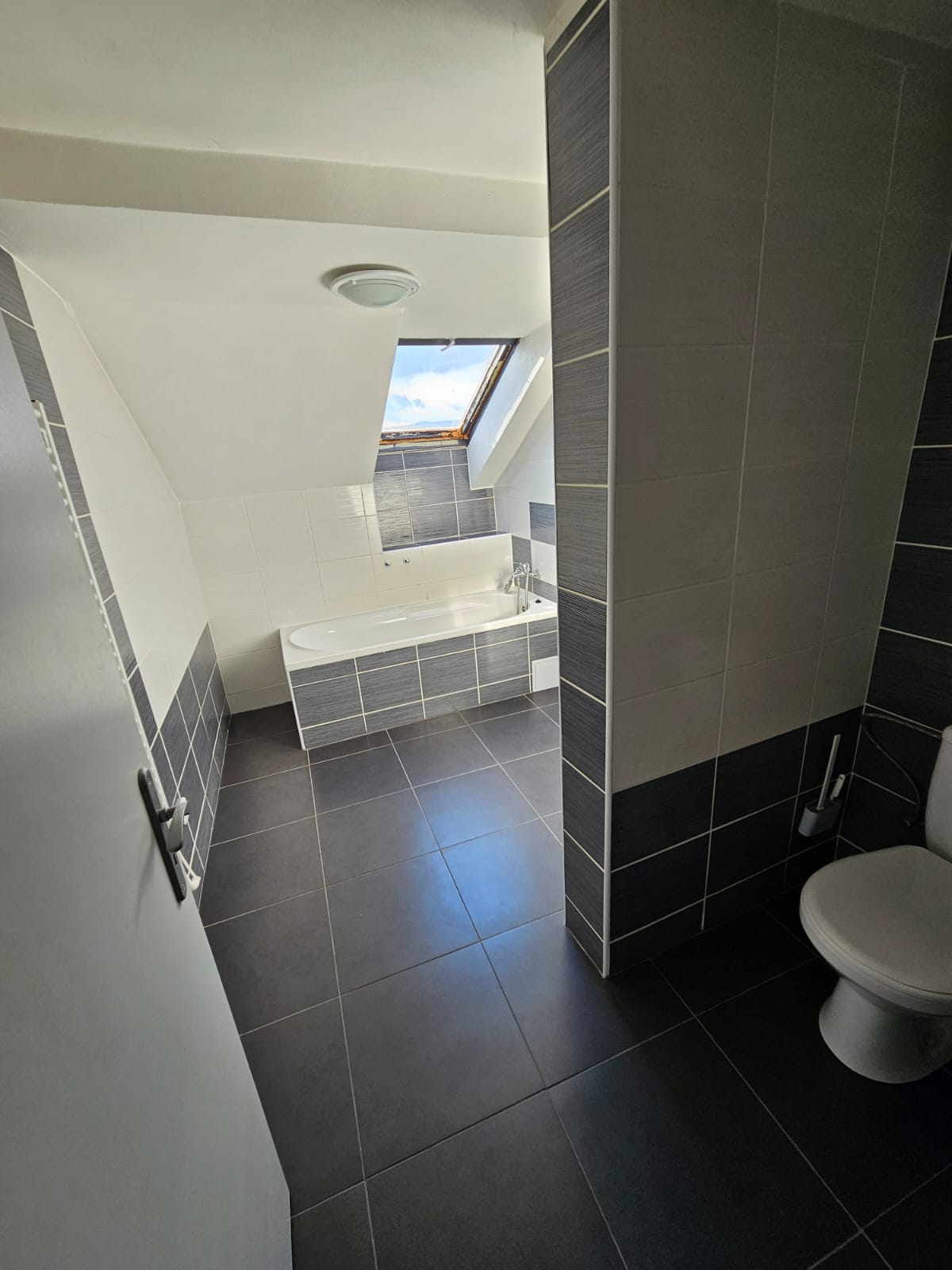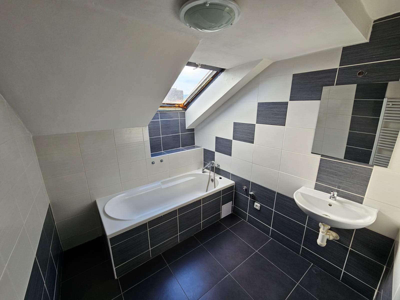 - Koupelna – vana, umyvadlo a toaleta. Okno pod střechou poskytuje přirozené světlo.